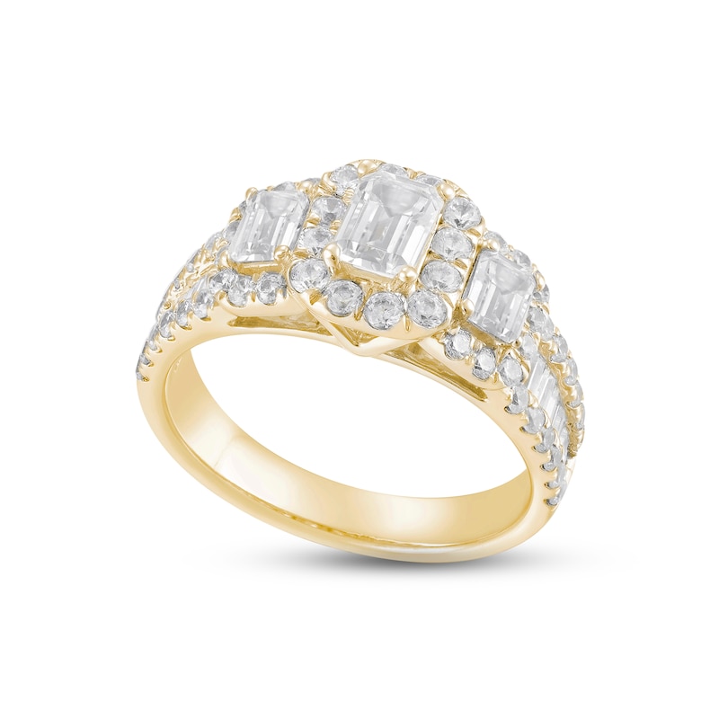 Diamond Three-Stone Engagement Ring 1-3/4 ct tw Emerald, Round & Baguette-cut Yellow Gold Plated
